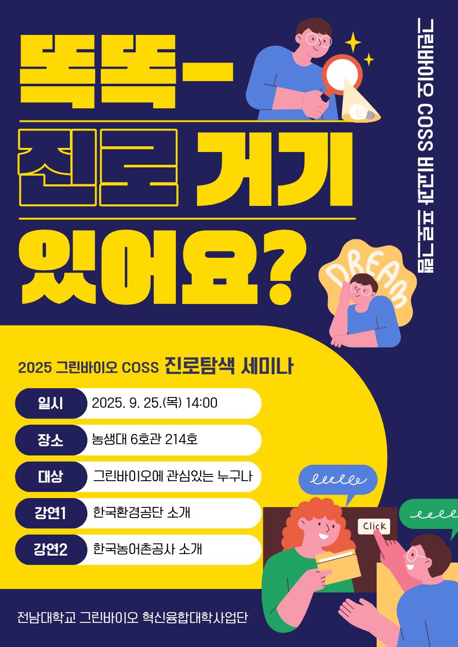 그린바이오 소재 발굴 및 활용 사례를 공유하고, 이를 통해 그린바이오 소재 분야의 진로 가능성을 모색할 수 있는 기회를 제공하고자 「2025 그린바이오 COSS 진로탐색 세미나」를 개최합니다. 관심있는 학생들의 많은 참여 바랍니다.